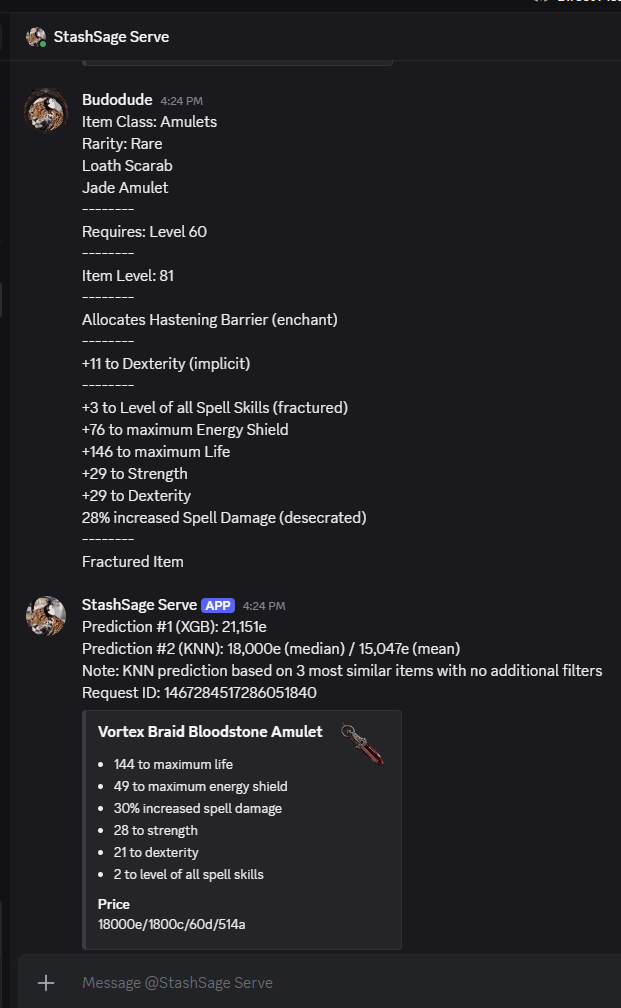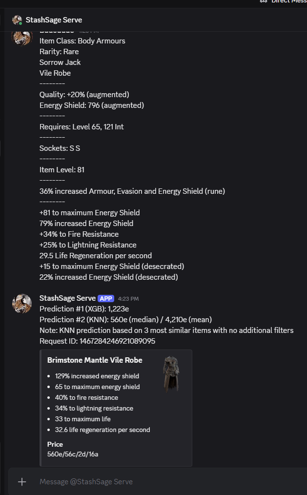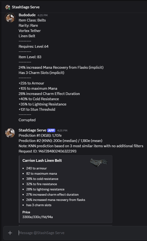 CTRL+Cto copy the item's in-game description. - Paste the description to StashSage Serve bot in our Discord channel to receive your predictions.
