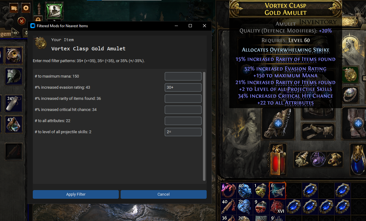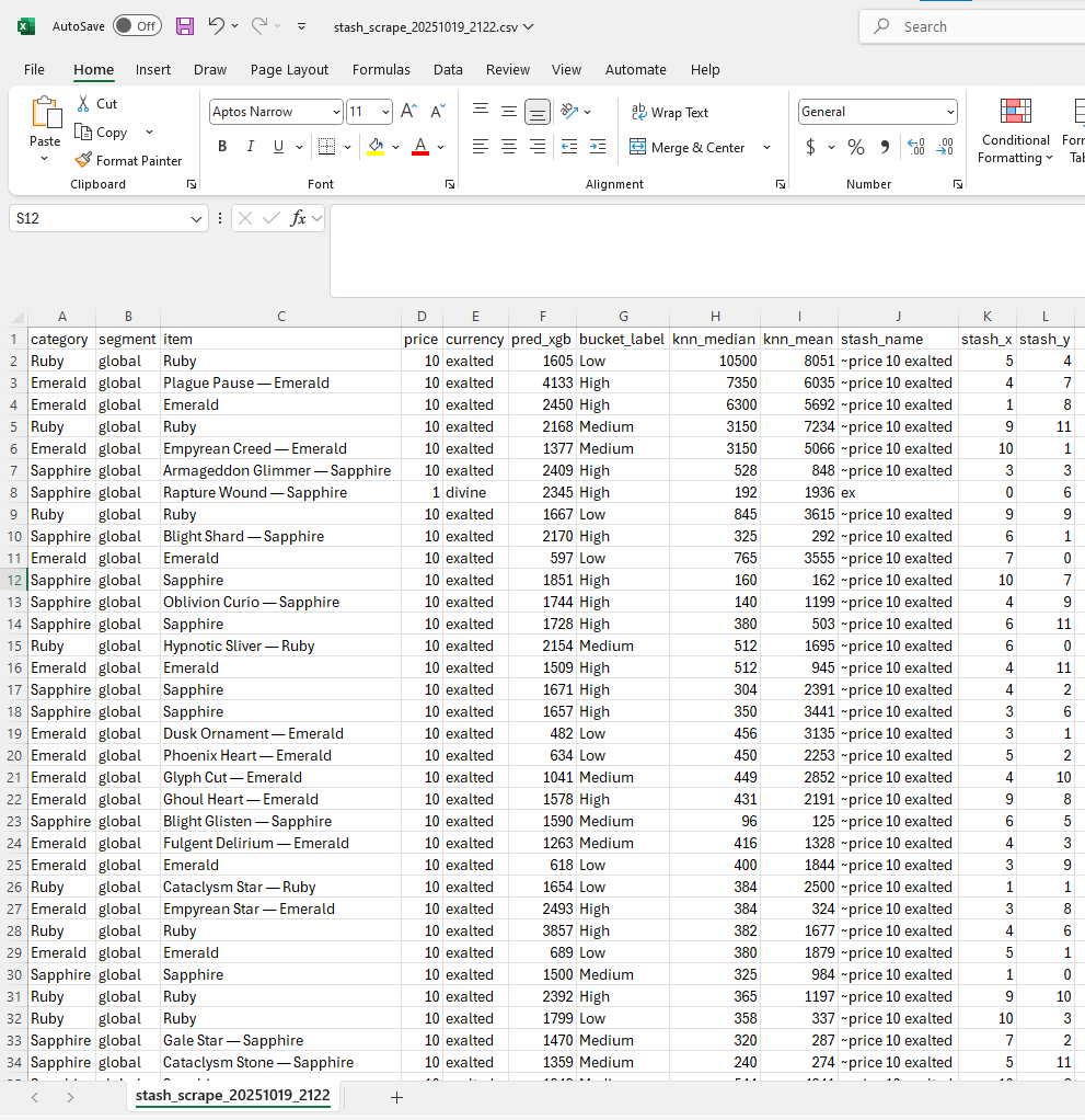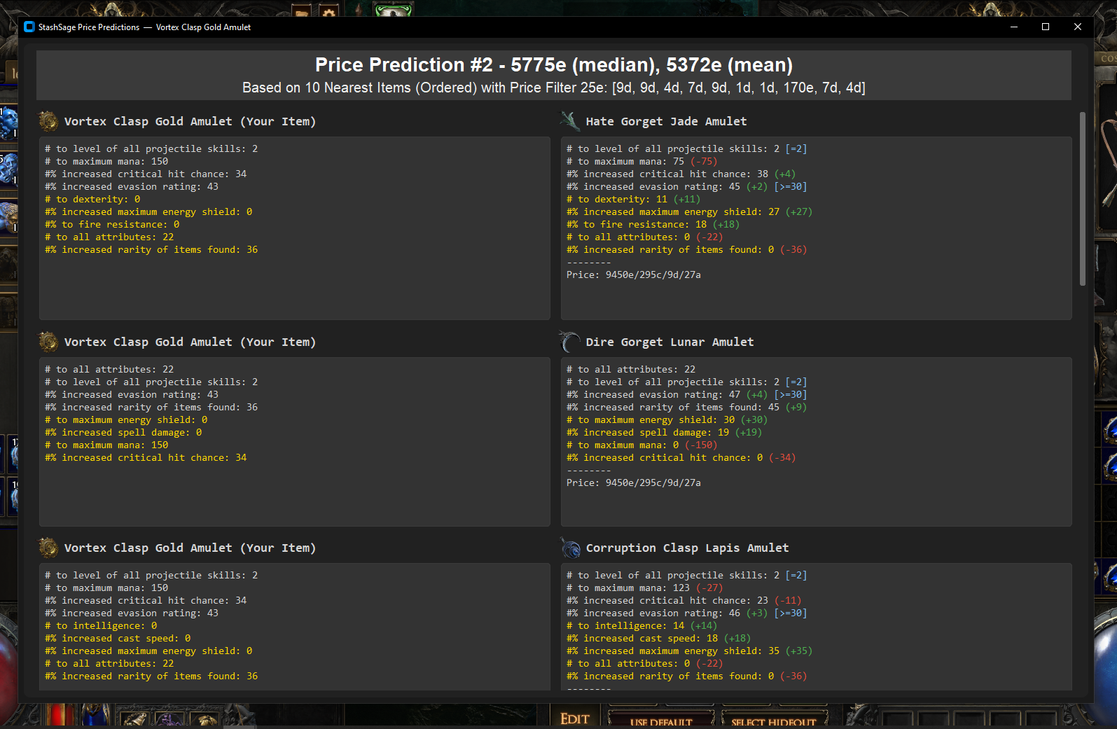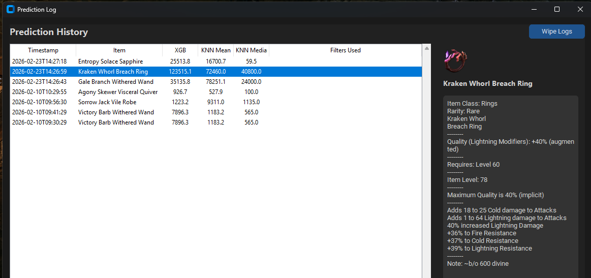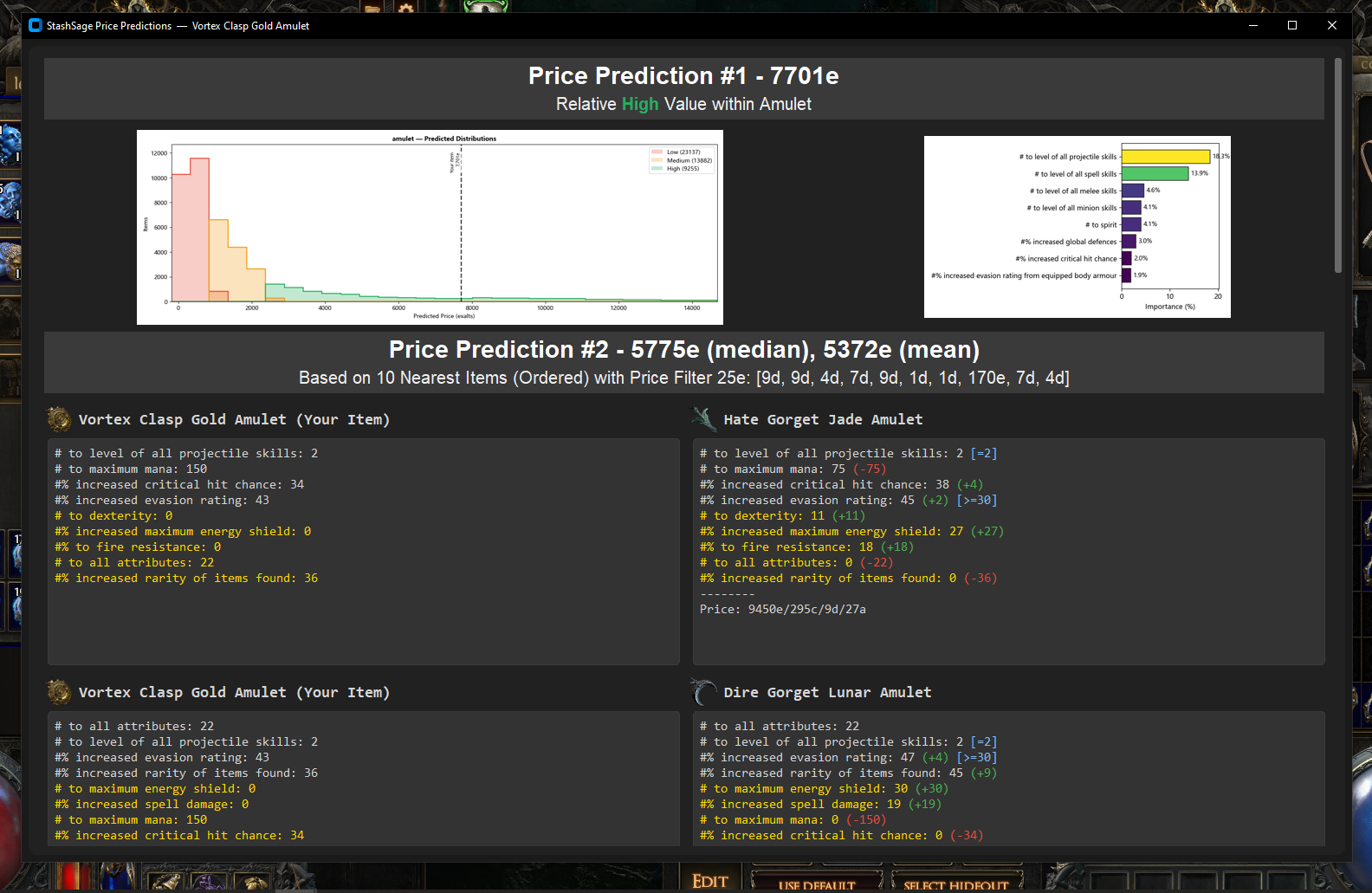 CTRL+2(or custom hotkey) to bring up the mod filters and filtered prediction overlay. - Review the predictions (#1 = xgboost, #2 = knn) and compare to similar items.