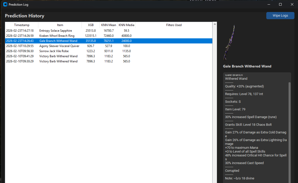 - The model ignores "corrupted", "fractured", "descrated" item statuses, socket counts (forthcoming).