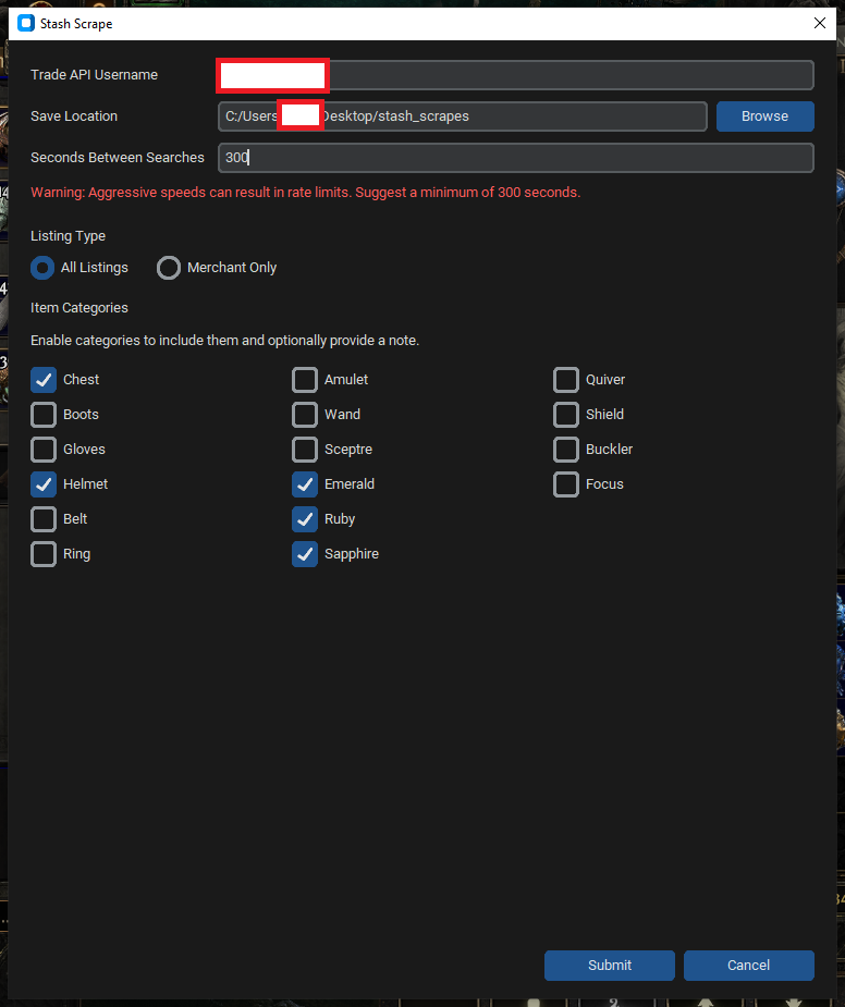 300s to minimize rate limiting. - Select the listing type (All Listings = public premium stash tabs + merchant tabs).